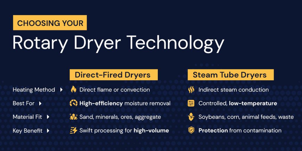 With your decision-makers in place, you can learn more about our rotary dryer offerings and determine which equipment best suits your application. Examining the specific applications of these rotary dryer types will clarify how each system handles volume removal using its own method.